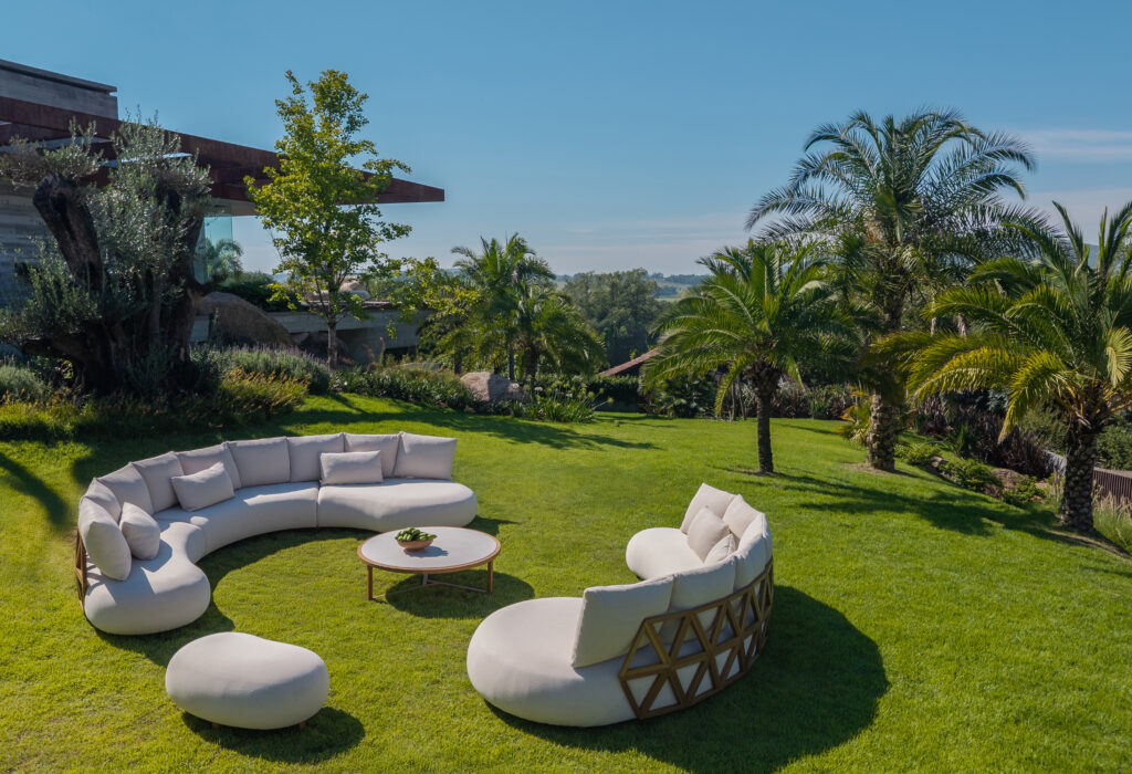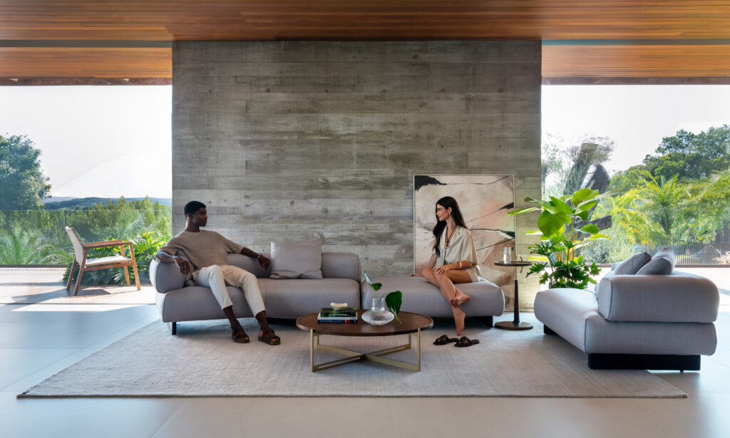Peças transitam entre ambientes mantendo a mesma lógica formal. A mesa Cleo, por exemplo, aparece em versões indoor e outdoor sem perder identidade. Nos estofados, sistemas modulares como Stuck e Abito oferecem flexibilidade e adaptação aos diferentes contextos arquitetônicos.