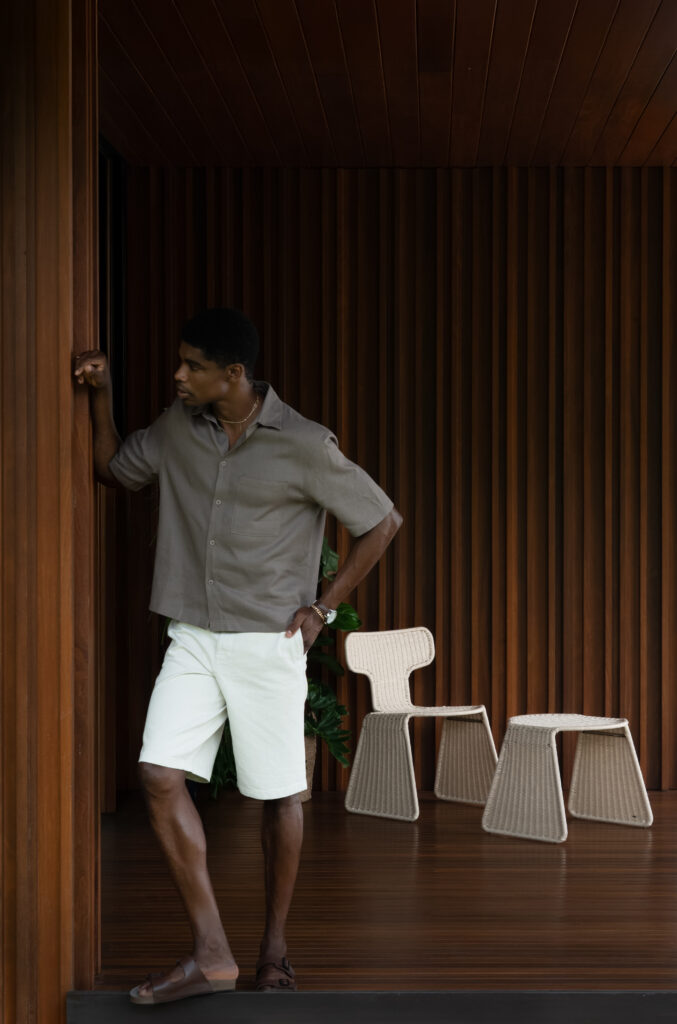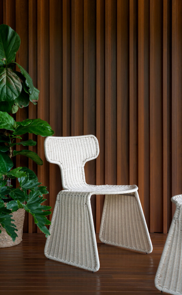 No outdoor, a marca amplia sua expertise com soluções que dialogam com a natureza sem abrir mão do rigor técnico. Materiais como malha acrílica e cintas exclusivas permitem novas possibilidades de trama, enquanto superfícies com aparência orgânica e texturas naturais reforçam a dimensão tátil do mobiliário.